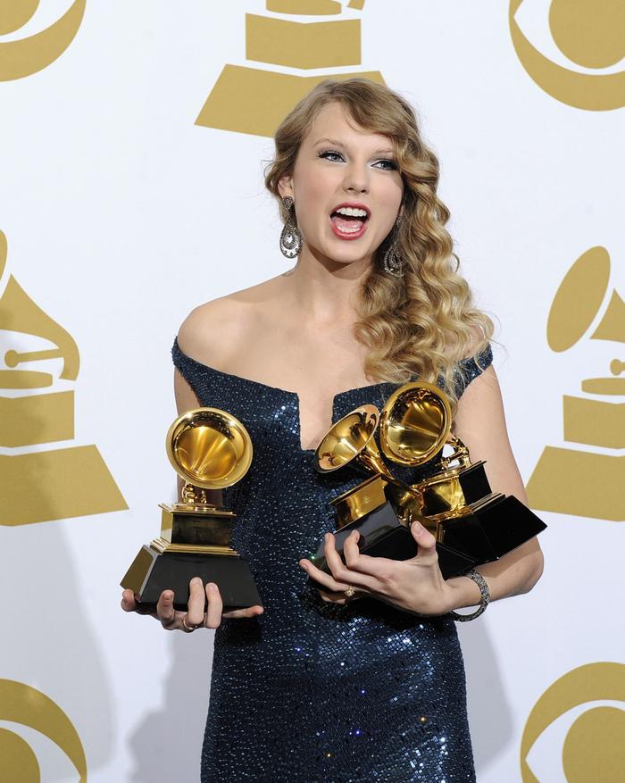 上图为2010年1月31日,泰勒·斯威夫特在洛杉矶举行的第52届年度音乐盛会上获得了三项格莱美奖,她非常兴奋。这位歌手身着“Kaufman Franco”的连衣裙以及“Ofira”和“Lorraine Schwartz”的珠宝,令歌迷看得眼花缭乱。