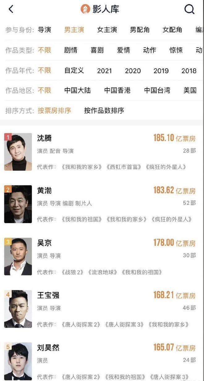 2月17日报道2月17日,据灯塔专业版实时数据,沈腾成为中国影史票房第一的演员,累计票房达185.1亿。黄渤紧随其后,位居第二,累计票房为183.62亿元,吴京以178亿票房的成绩,暂列第三名。王宝强和刘昊然则位居第四、第五名的位置。