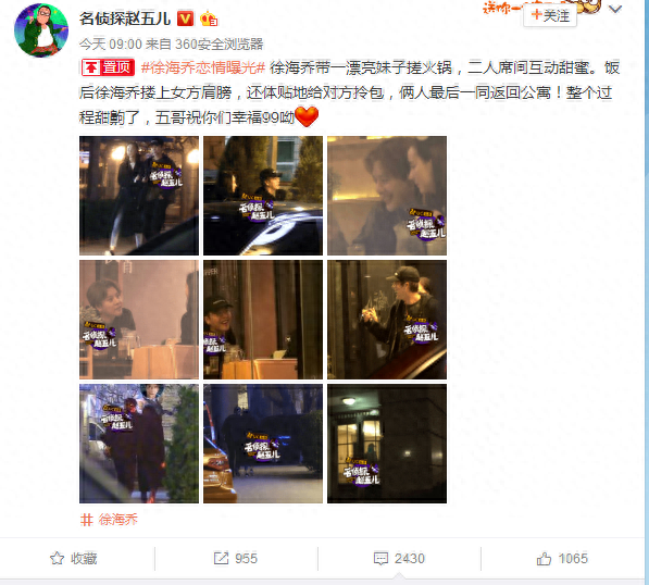 据赵五儿爆料称,徐海乔带着妹子一同吃火锅,饭后贴心的为妹子那驴牌包包(也是有钱),最后一同返回公寓。从大图来看,妹子和高挑,肤白貌美,跟徐海乔还挺搭配的。