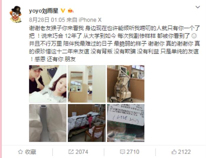 微博称:谢谢老友猴子你来看我 身边现在也许能倾听我唠叨的人就只有你一个了把 !说来巧合 12年了 从大学到如今 每次我副惨样样 都被你看到了 并且不行万里 陪伴我最难过的日子 最脆弱的样子 谢谢你 真的谢谢你 真的很珍惜这十二年来友谊 没有背叛 没有欺骗 没有利益 只是单纯的友谊 !感恩 还有你 朋友
