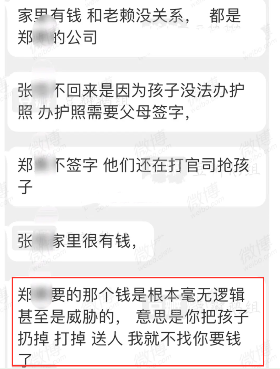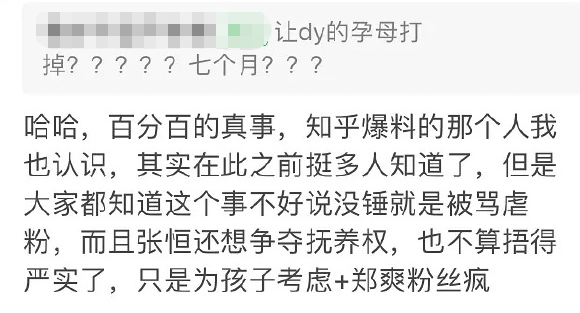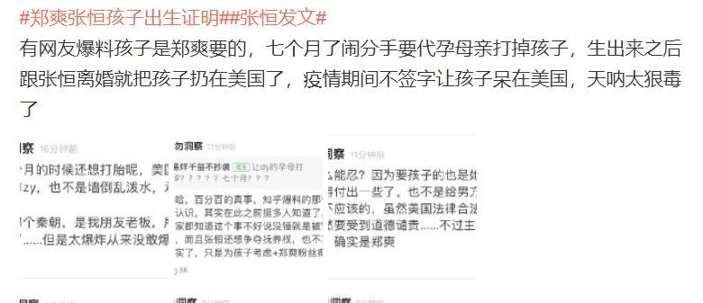 有知情人爆料,郑爽在代孕之后,两人闹分手,郑爽不想要孩子了,要求打掉,但张恒没有同意,两人一直谈不拢,郑爽并不想要孩子,于是用钱来威胁张恒,如果把孩子打掉的话,就可以不要这个钱了,不过爆料的真实性仍有待确认。