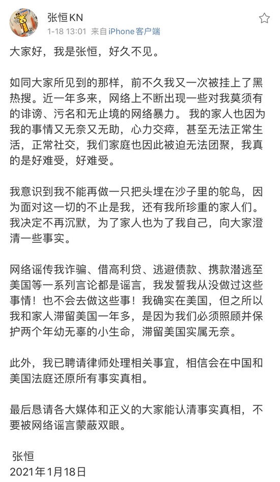 2021年1月18日,张恒发文,辟谣网上传出他诈骗、借高利贷、逃避债款、携款潜逃至美国等言论,并且透露自己确实是在美国,和家人已经在美国滞留一年多,是因为要“照顾并保护两个年幼无辜的小生命”。