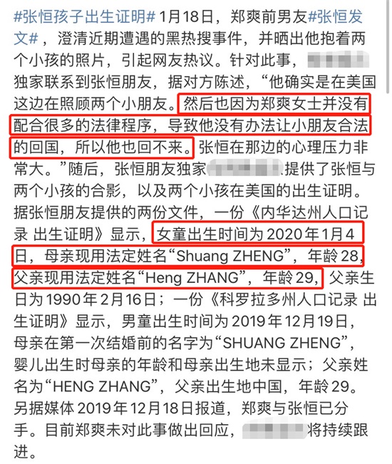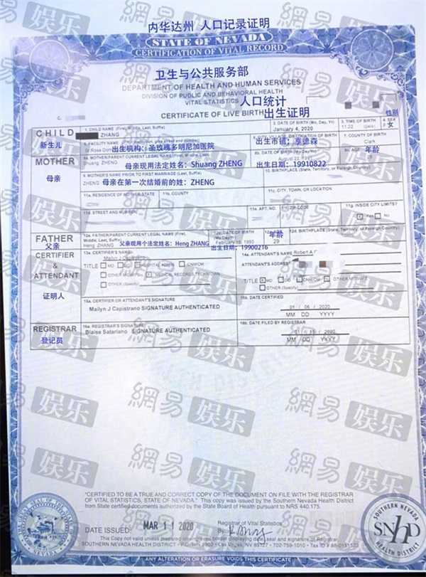 最令吃瓜群众震惊的是,在孩子的出生证明上,母亲的现用法定名字是“Shuang ZHENG”,年龄28,父亲现用法定名字是“Heng ZHANG”,出生地是中国,年龄29,年龄和名字都和郑爽对上了,一时间关于郑爽和张恒生子刷屏了。