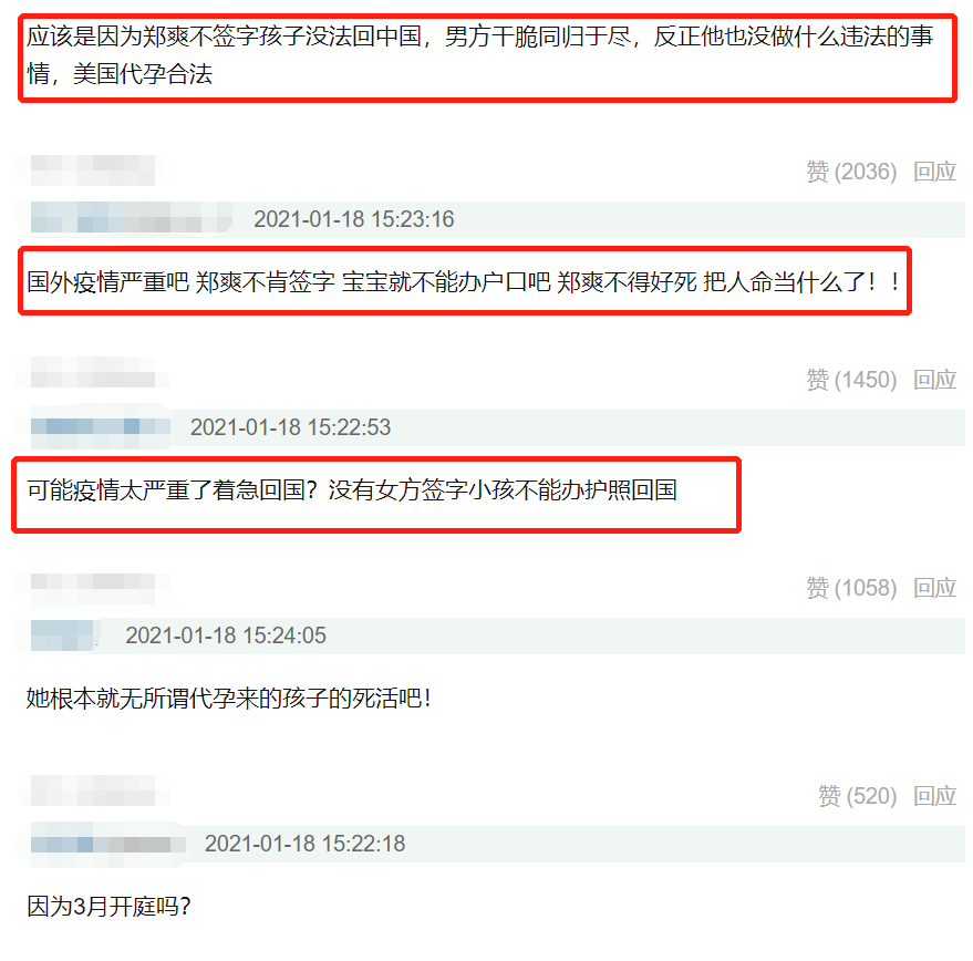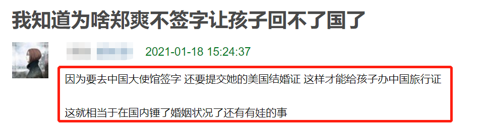 同时,网友也分析,郑爽一直不肯配合是怕消息被爆出,因为两个孩子如果要从美国回来,必须要郑爽去中国大使馆签字,还要提交结婚证书,这样等于就锤了郑爽的婚姻状况和有孩子的情况,加上孩子若真是回国,被媒体曝光的可能性很大,所以郑爽不愿意配合。