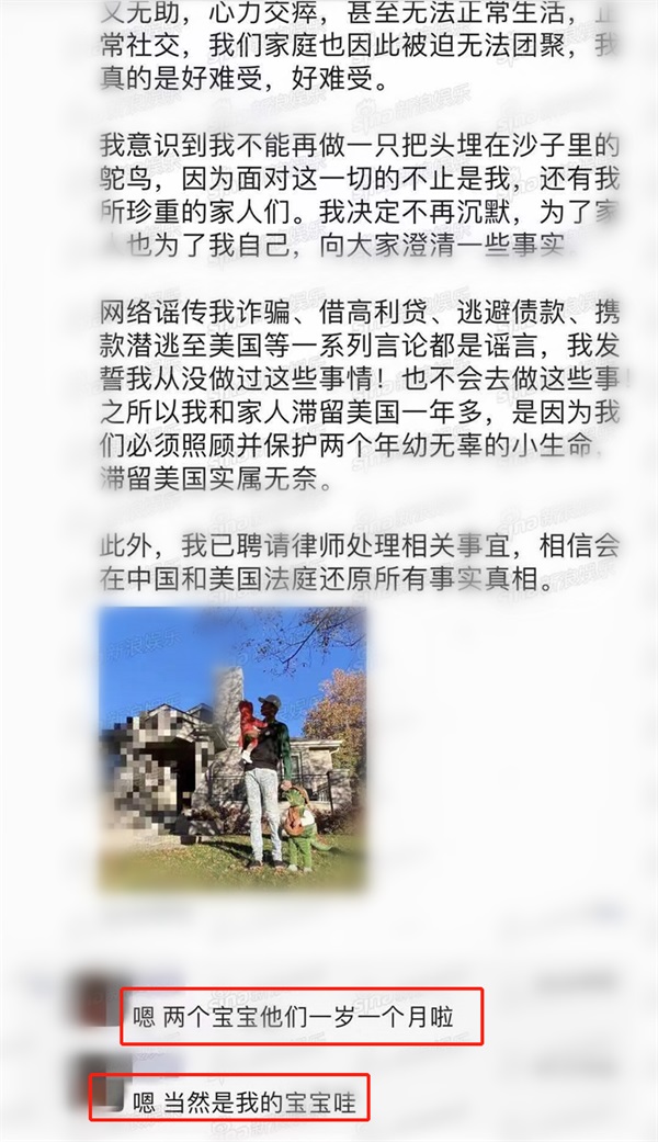 张恒还晒出了与两个孩子的合影,关于孩子的身份引发网友的热议,随后张恒在朋友圈承认两个孩子是自己的,今年已经一岁一个月了。
