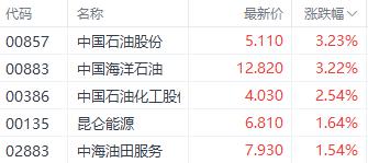 受上述消息影响,布伦特原油期货周二涨 2.5%,报每桶 81.07 美元,盘中最高上涨 3.4%。这一反弹势头传递港股石油板块,其中中国石油股份、中国海洋石油领涨其板块。