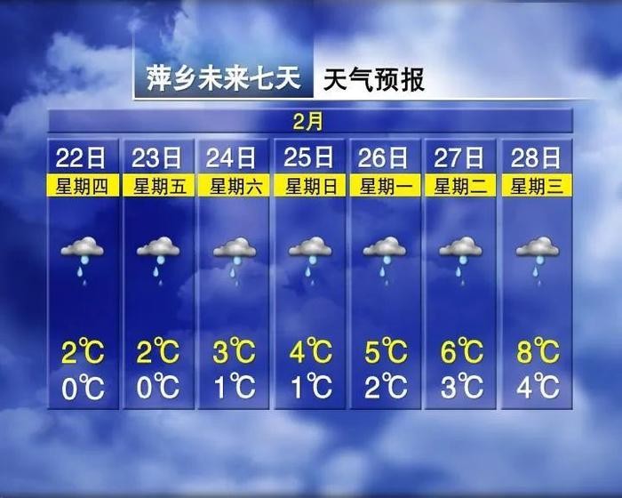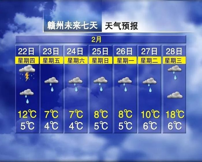 具体预报为:今天下午到晚上萍乡、新余、鹰潭、吉安、抚州五市和宜春、南昌、上饶三市南部以及赣州市北部阴天有中到大雨或雷雨,部分地区有暴雨;赣州市南部多云转阵雨或雷雨;景德镇市和宜春、南昌、上饶三市北部阴天有中雨或雷雨,局部有大到暴雨;九江市阴天有小雨,局部山区有冻雨或雨夹雪。雷雨来时,部分地区有强雷电、短时强降水,局部地区有雷雨大风、冰雹等强对流天气。