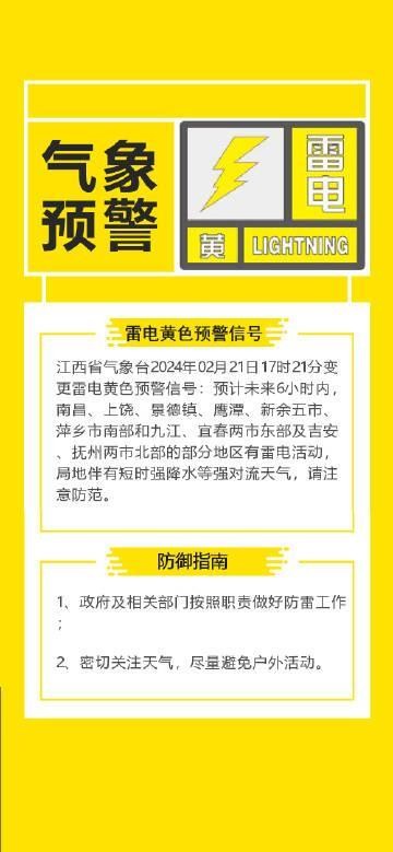 江西省气象台2024年02月21日17时21分变更雷电黄色预警信号:预计未来6小时内,南昌、上饶、景德镇、鹰潭、新余五市、萍乡市南部和九江、宜春两市东部及吉安、抚州两市北部的部分地区有雷电活动,局地伴有短时强降水等强对流天气,请注意防范。