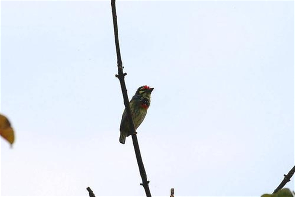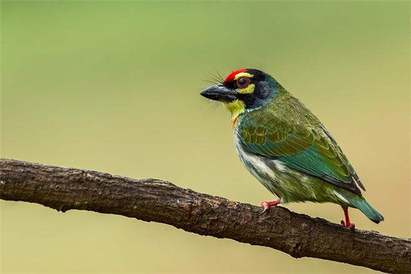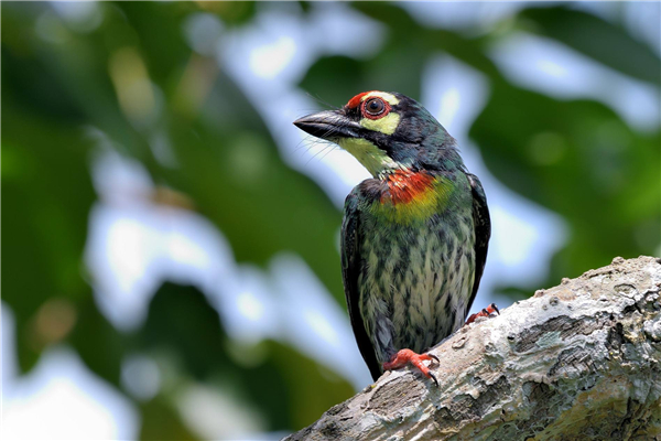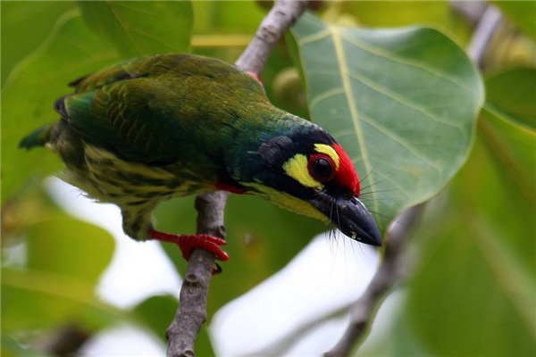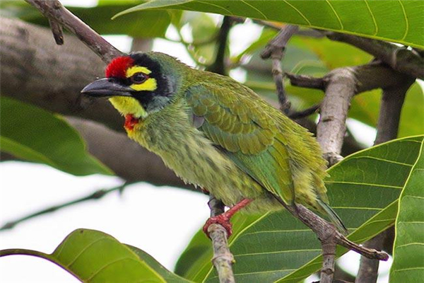 赤胸拟啄木鸟端倪以及额头处的脸色都为朱赤色,而且在中央会有一条乌色戴,眼睛是乌脸色,在眼睛上头还会有黄色斑块,头部以及脖子处成绿色,背部,腰部以及肩膀部位呈橄榄绿,而且还会有黄色的装点。