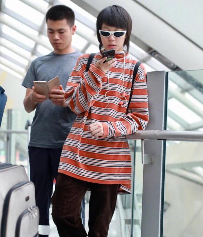 窦靖童在机场现身非常低调,这个条纹控女孩,穿一件红蓝色条纹衫,下面穿棕色休闲裤,一身宽宽大大的造型,很像她之前喜欢的嘻哈风。一头短发的窦靖童,戴个超酷的复古墨镜,这种打扮是主流还是非主流?