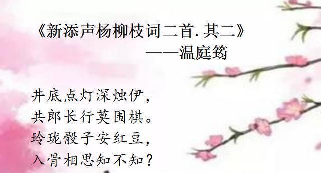 第三首是温庭筠写的《新添声杨柳枝词二首.其二》,这首诗借井底点灯和长行围棋的骰子抒写女子对情郎的眷恋。全诗在语言修辞方面,妙用谐音双关的手法,富有民间的生活气息,表现了极高的艺术水平。这首诗最精粹的地方在于后二句以相思子为喻,寄托女子的挚爱深情。“入骨相思知不知”七个字,乃是全篇的点睛之笔。
