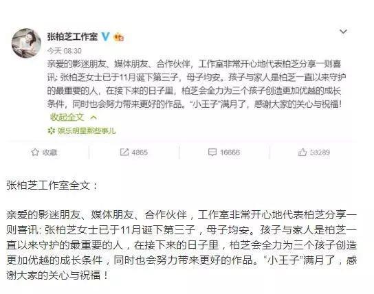 今天张柏芝的工作室在微博上宣布,张柏芝女生在11月诞下了第三个孩子,母子二人平安,张柏芝会为了孩子的未来创造更加优越的成长条件,感谢大家的祝福。