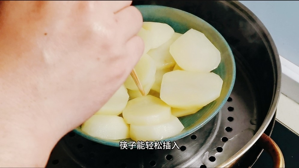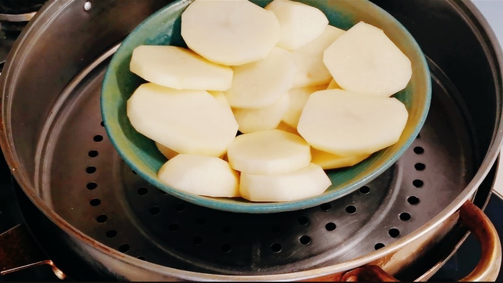 1,将土豆削皮,洗净然后切成片,放入碗中。上蒸锅蒸20分钟。