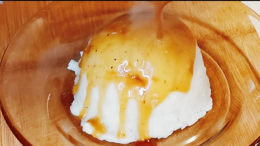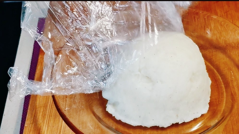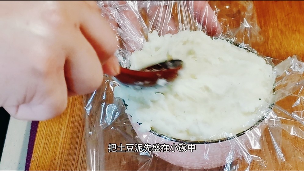 4,准备一个小碗,地下铺上保鲜膜,将土豆泥先盛在小碗中,然后倒扣在盘中,撕掉保鲜膜,一个完整的形态就出来了,将调好的料汁倒入锅中加热,然后淋在土豆泥上,大功告成。
