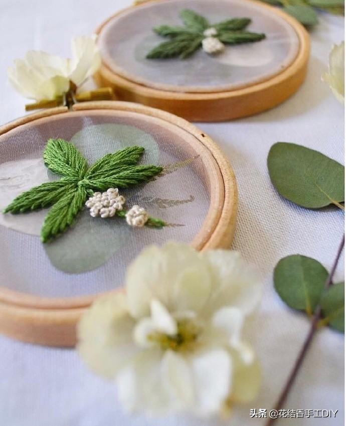 即使是简简单单的几片树叶,绣在这种透明的面料上,竟会带给人一种沁人心脾的清凉感觉。如果是绣在夏天的衣裙上,该是多么的美妙……