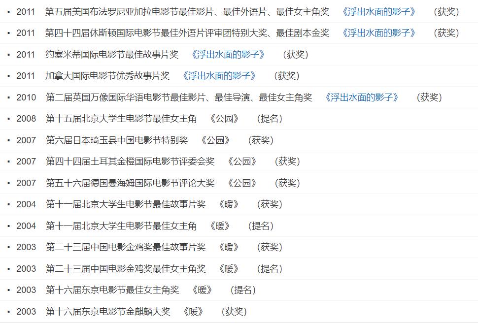 毕业第三年,她就凭借电影《暖》斩获第十六届东京电影节金麒麟大奖,并在随后的十年中,陆续在休斯顿国际电影节等各类国际电影节上大放异彩,获得十项大奖,是当之无愧的国际影后。