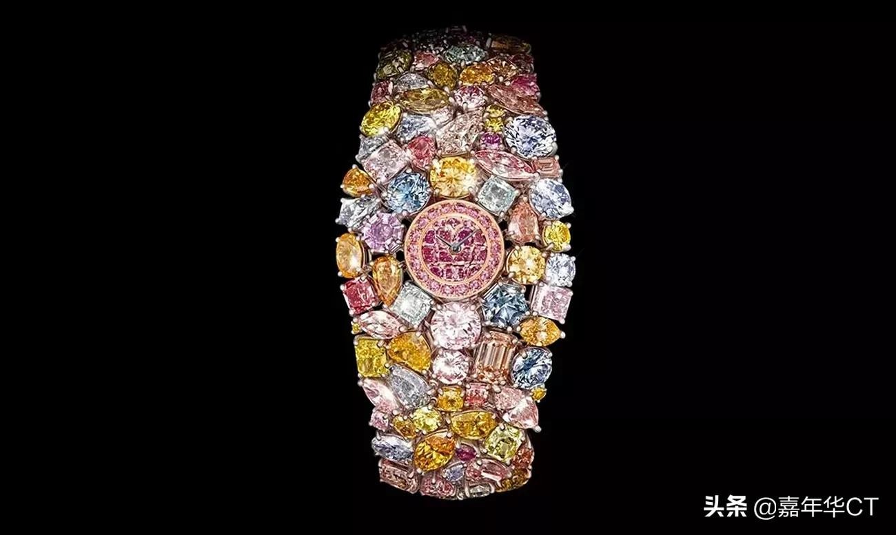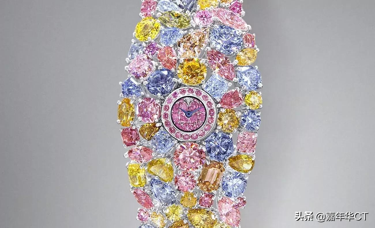 它是蓝色、黄色、粉色和绿色等颜色和形状的和谐融合,与心形、翠绿色、梨形、卵形和圆形相配。这是金钱能买到的最好、最贵的手表!
