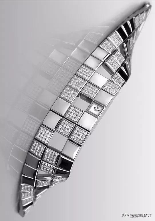 此外,这款手表还镶嵌着价值100克拉的长方形钻石,散发着轻松自在的奢华和优雅气息。