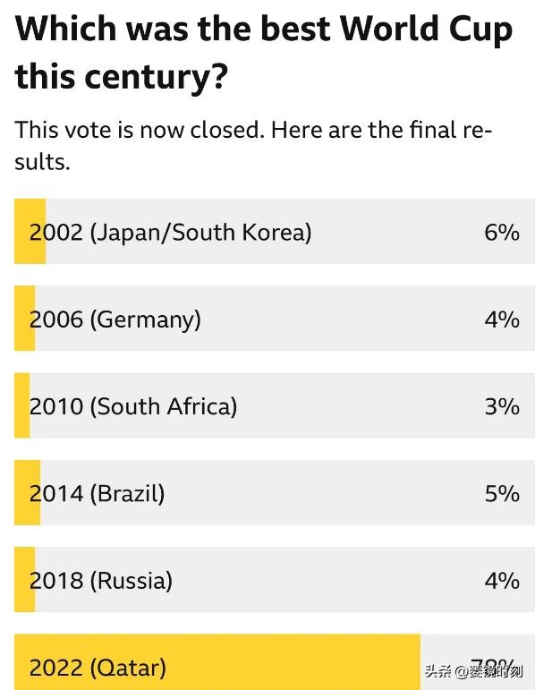 毋庸置疑,这届世界杯的故事是丰富多彩的,也是最好的。国外一家大型媒体机构的网络调查显示,78%的国际网友认为卡塔尔世界杯就是最好看的一届,排名第2的是2002年日韩世界杯,得票率只有6%,差距如此悬殊再次证明“球迷的眼睛是雪亮的”!