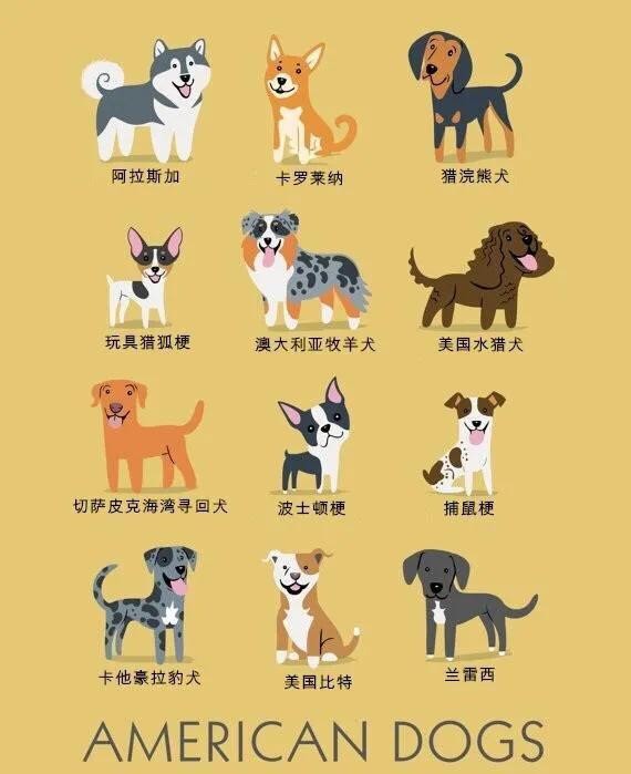 阿拉斯加雪橇犬、卡罗莱纳犬、猎熊犬、猎狐梗犬、安纳托利亚牧羊犬、美国水猎犬、乞沙比克猎犬、波士顿梗犬、捕鼠梗犬、加泰霍拉豹犬、美国比特斗牛犬。