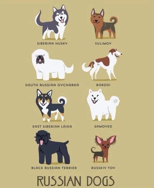 哈士奇犬、苏利莫夫犬、南俄罗斯高加索犬、苏俄牧羊犬、东西伯利亚莱犬、萨摩耶犬、黑毛俄罗斯梗犬、俄罗斯玩具犬。