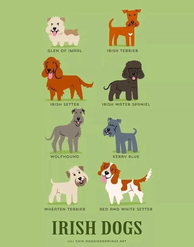 艾莫劳峡谷梗犬、爱尔兰梗犬、爱尔兰雪达犬、爱尔兰水猎犬、猎狼犬、凯利蓝梗犬、爱尔兰软毛梗犬、红白赛特犬。