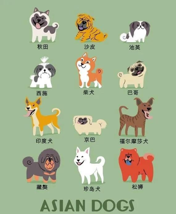 秋田犬、沙皮犬、日本狆、西施犬、日本柴犬、巴哥犬、小鹿犬、北京犬、台湾犬、藏獒、韩国金多犬、松狮犬