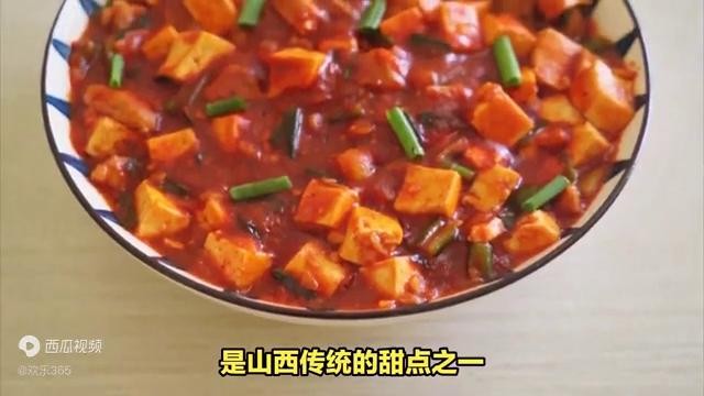 ·九、糖豆腐。将豆腐切成块,加入糖汁和红糖,轻轻烹制而成,软糯可口,是山西传统的甜点之一。
