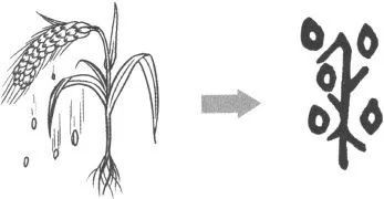 “粟的”甲骨文字形中间像是一棵成熟的谷子,四周围的小圈表示谷粒脱落。