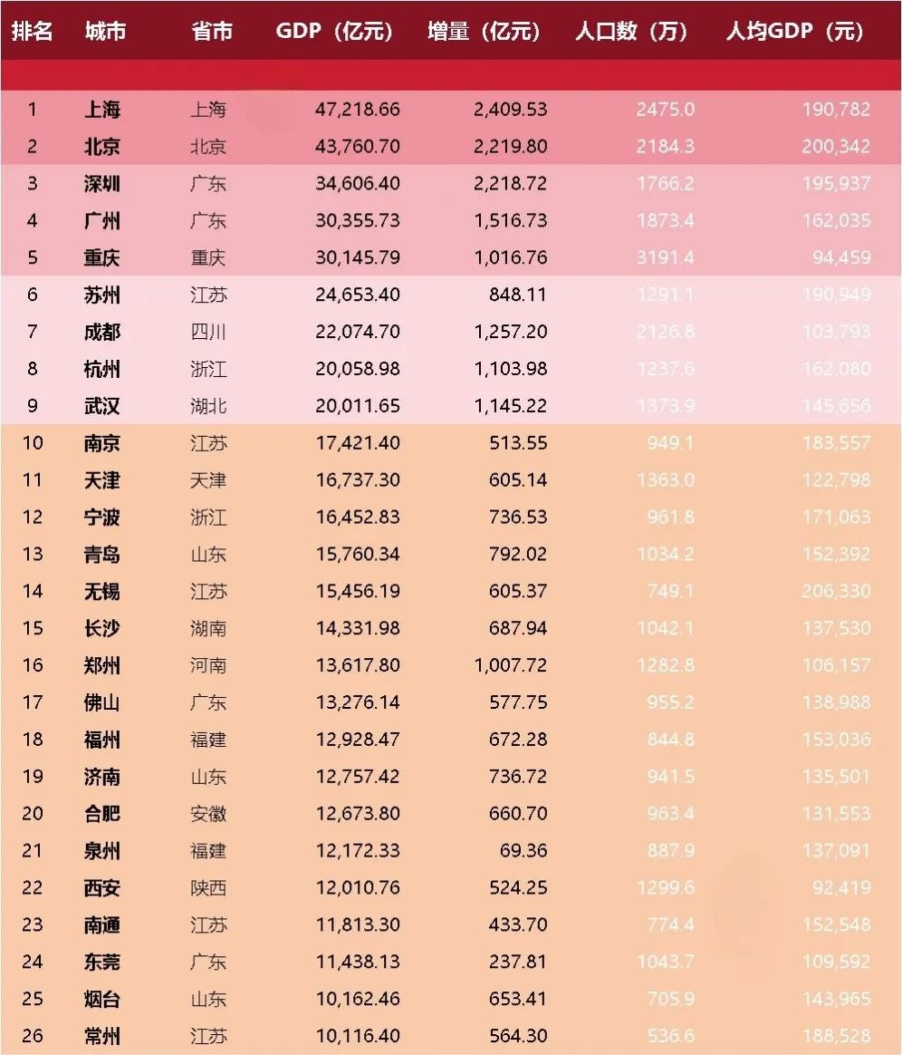中国十大城市分布如下(重庆不算):综合人口总量、经济总量、政治地位、科教文卫等,我国经济10强城市,也基本是综合实力十强了!