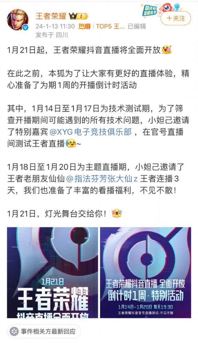 2024年1月14日,知名王者荣耀主播张大仙及其XYG战队现身王者荣耀抖音官方账号的直播间,进行了一场特别的直播测试。此次直播的目的主要是为了在即将到来的全面开放之前,排除所有可能的问题,以确保观众们能享受到最佳的直播体验。