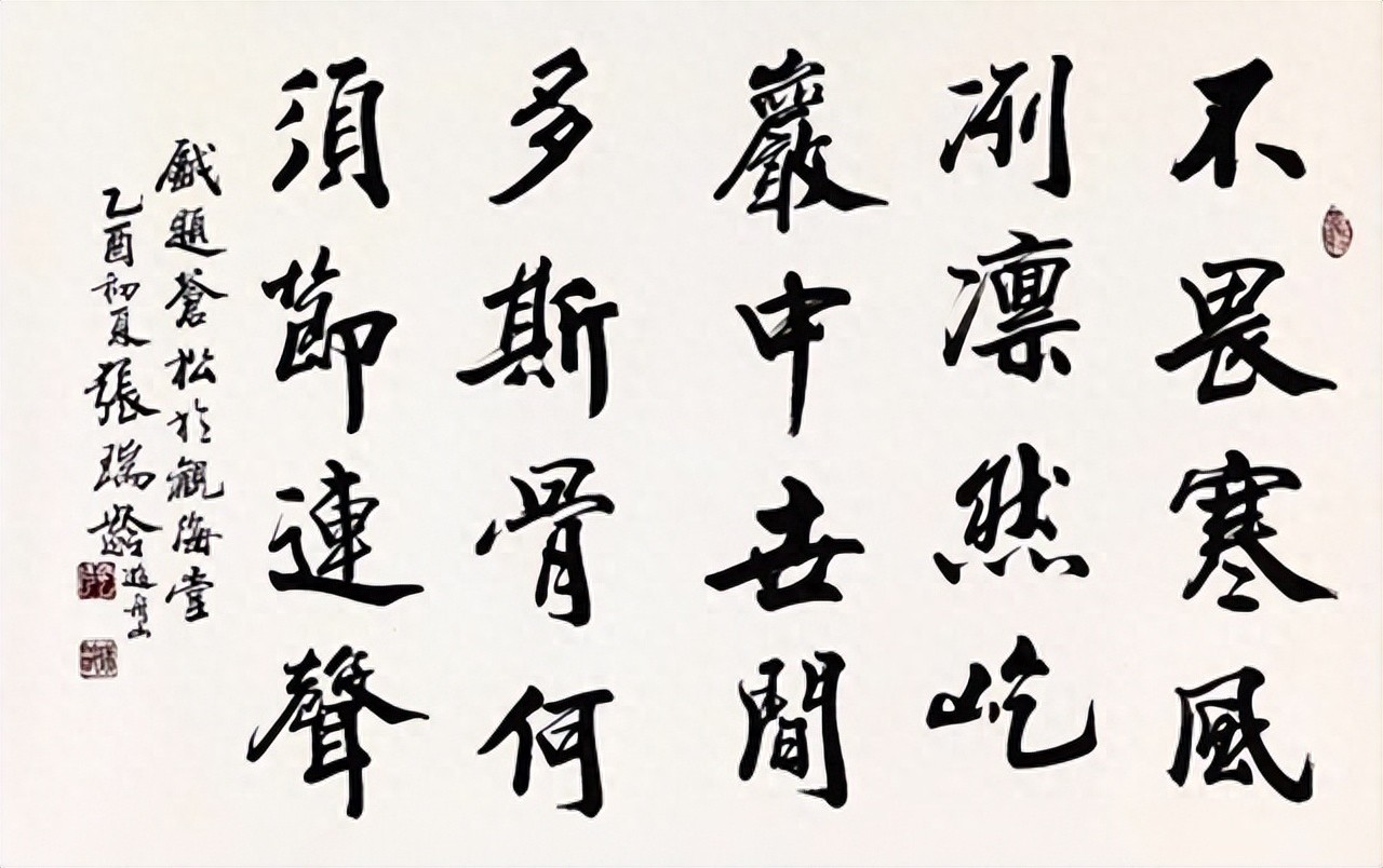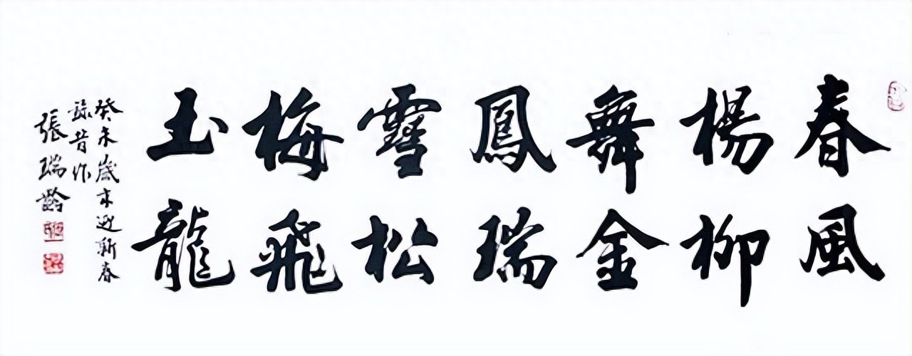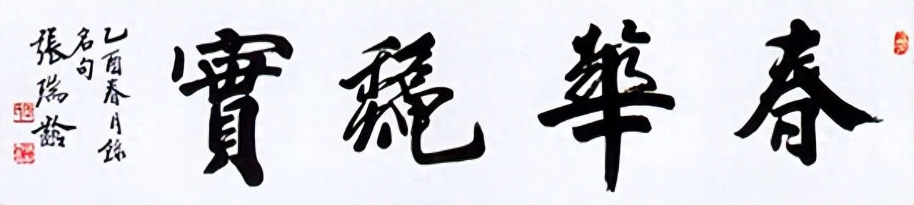 张瑞龄对楷书有着独到的理解,能够游刃有余地掌控各种榜书和蝇头小楷。他的笔画给人一种雄强之感,融合了欧楷的严谨法度和褚遂良楷书的君子之气。他处理点画的打磨推敲不仅到位,而且关系处理得十分得当,体现了一种变化性。结构上的严谨散发出古朴典雅的气息,楷书中还透露出一种正大气象,同时也充满了碑帖的刚强之感,可见,碑帖结合是他楷书的一大亮点。