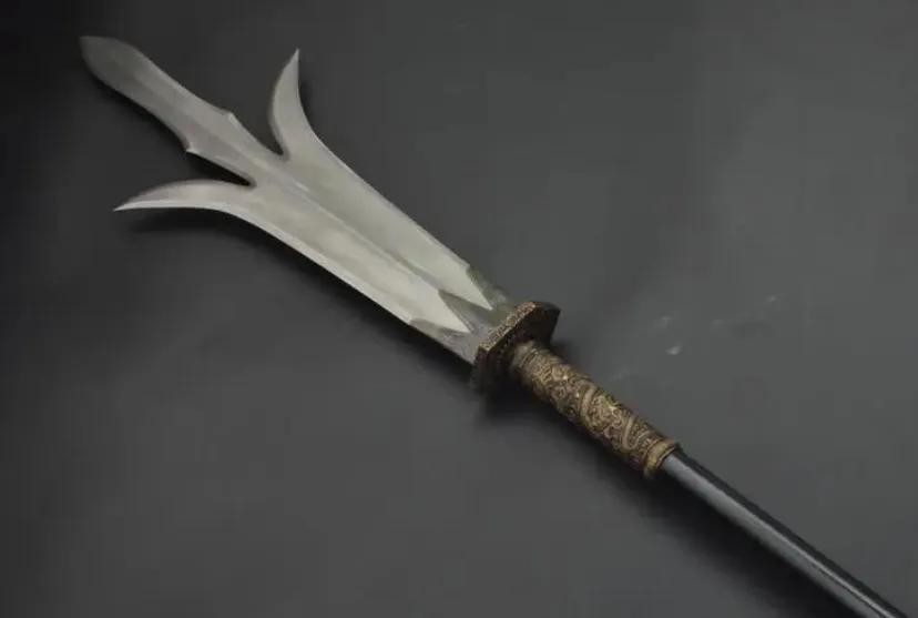 三尖两刃刀是纪灵的兵器,纪灵是袁术帐下将领,奉命率军攻打刘备,在盱眙之战中被吕布用方天画戟所斩杀。三尖两刃刀长约四尺,刀身有三个刀尖和两个刀刃,因此得名三尖两刃刀。三尖两刃刀的重量达到了63斤,是三国时期较轻的武器之一。