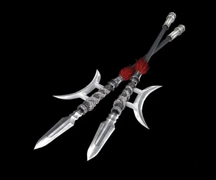 双铁戟是典韦的兵器,典韦相貌魁梧,膂力过人,使一双铁戟。典韦在曹操征讨吕布时表现英勇,被拜为校尉,双铁戟长约三尺,戟头有两个尖锐的铁刺,因此得名双铁戟。双铁戟的重量达到了 270 斤,是三国时期最重的武器。