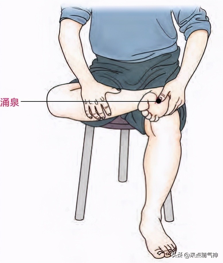 取穴妙招正坐,把一只脚跷在另一只脚膝盖上,脚掌尽量朝上脚心最凹处即是