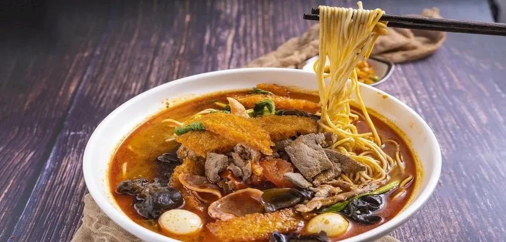 皮肚是把鲜猪肉皮晒干后制成。面里的皮肚吸满了鲜美的高汤,变得胖胖的,很有弹性。面条筋道,再加上肉丝、鸡蛋、青菜等配菜,一碗下去超满足。