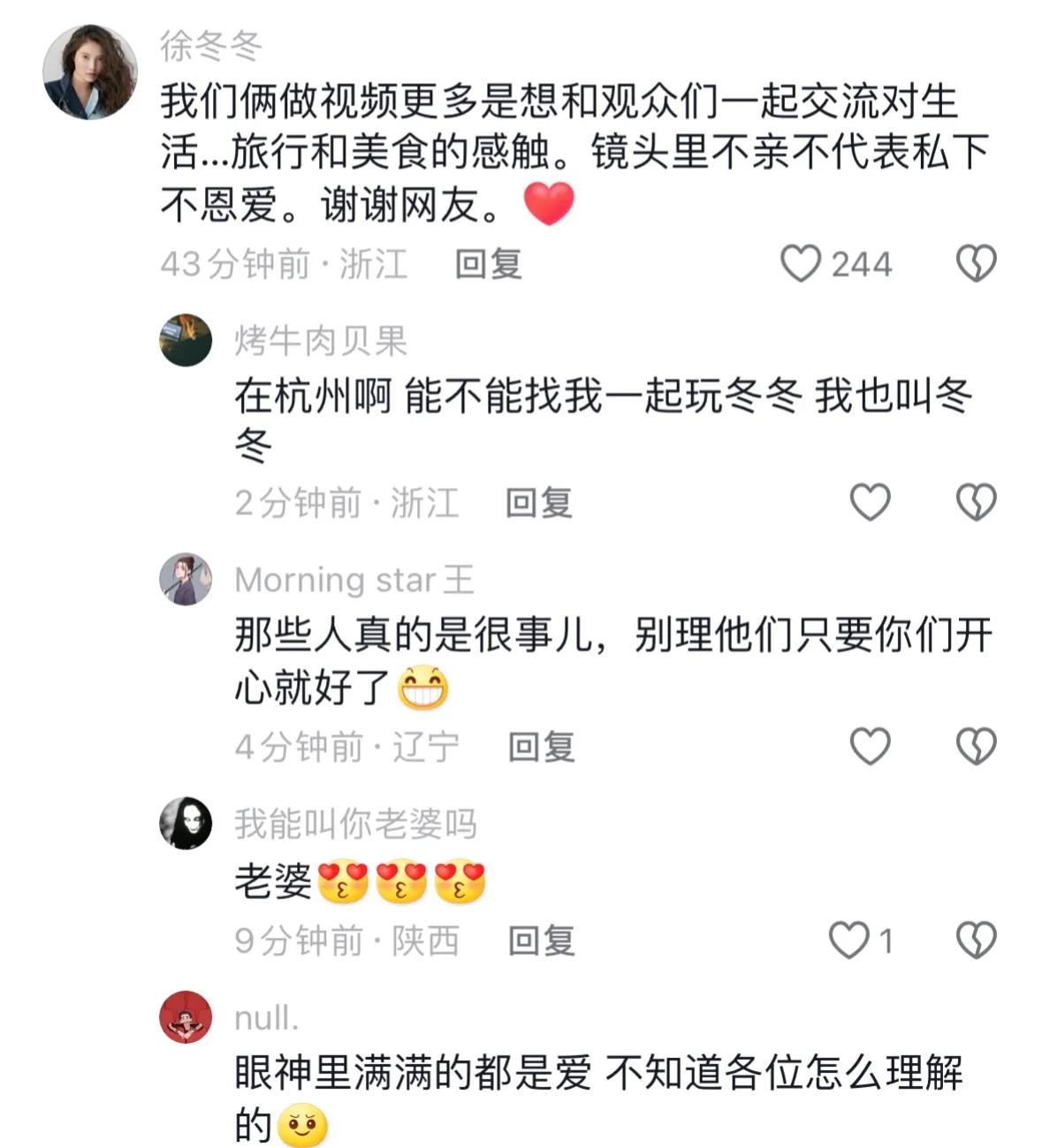 针对网友的疑问,徐冬冬毫不避讳地回应了这一问题,她直接面对回复称:“首先当然不是我们俩做视频更多是想和观众一起交流,对生活旅行和美食的感触。”徐冬冬强调镜头里的不亲密并不代表私下的不恩爱。