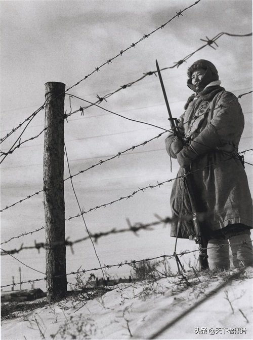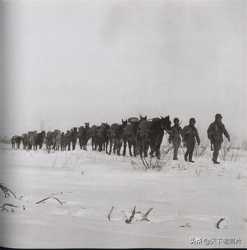 冰雪覆盖的田野上,国民党士兵在进行调防行军。