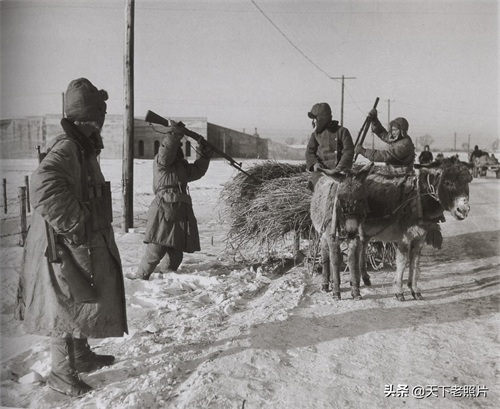 国民党士兵用刺刀刺进了骡车上的柴火中,以探查里面是否藏有“敌军”。