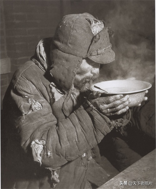 一位退役老兵在美国浸礼会设立的救济站里喝小米豆粥