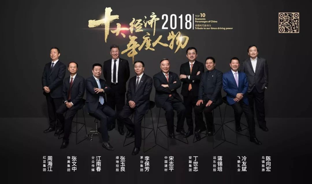 中国建材集团董事长宋志平、中国贵州茅台酒厂(集团)有限责任公司党委书记董事长总经理李保芳、远东控股集团董事局主席蒋锡培、红豆集团董事局主席兼CEO周海江、分众传媒创始人董事长江南春、物美集团创始人董事长张文中、绿地控股集团董事长总裁张玉良、安踏体育用品集团董事局主席兼CEO丁世忠、飞鹤乳业董事长冷友斌、乌镇景区古北水镇景区打造者陈向宏当选“2018十大经济年度人物”。
