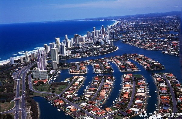 从高空看,澳大利亚的黄金海岸的运河和人工小岛看起来就像是镶嵌在昆士兰州沼泽地的七巧板。黄金海岸的面积是威尼斯的9倍,这里是水上运动的中心。游客可以在运河中享受夕阳游船晚餐秀,划独木舟,乘坐高速游艇,还可以冲浪。