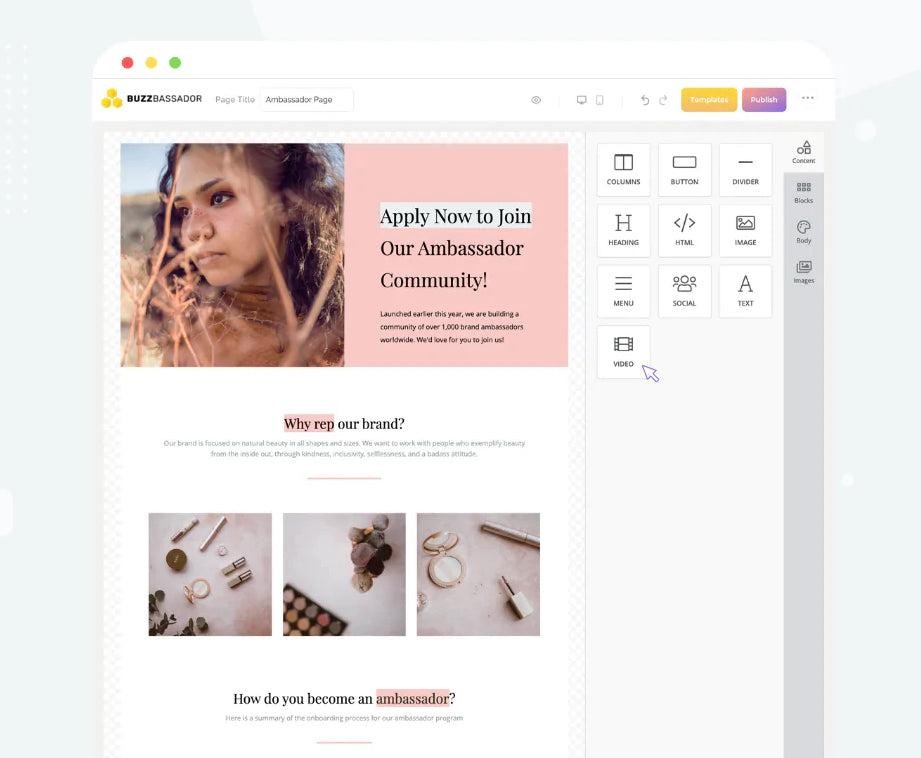 这个APP的功能是帮助卖家招募KOL,留存忠实消费者,使用Buzzbassador 的页面生成器能够定制一个专门的登陆页面,并设置邮件自动发送。