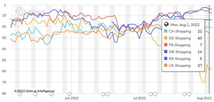而SHEIN算上sheinside.com时期做婚纱出口贸易的前身,成立时间已有10余年,两者体量上的差距与成立时间不无关系。目前,Cider美国地区的下载量已经占到其全球总下载量的43%。2022年上半年,Cider在美国录得200万次下载,相较于去年同期涨幅为1686%,对比起SHEIN是凤毛麟角,但比起同时期闯美的服饰出海品牌,无疑是最优秀的那一个。Sensor Tower称,Cider的其他主要市场是英国、德国、法国、加拿大和韩国。Data.ai发布数据显示,Cider目前在法国和韩国是位居下载量排名前10位的购物类应用。