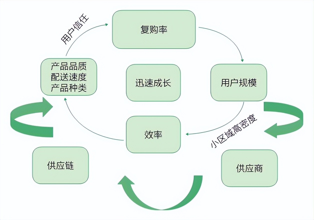 能支撑叮咚买菜增长的“双飞轮模式”(见图1),用更好的用户体验吸引新用户,进一步驱动采购增加,此时总订单增长,而从供应端角度,规模性的订单能够提升对上游的议价能力;另一个飞轮是对已有数据进行分析,进一步优化运营细节,提升运营效率。