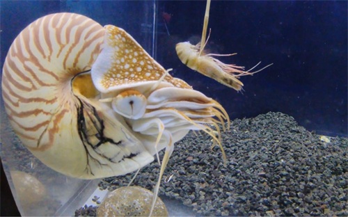 鹦鹉螺是一种古老的海洋软体动物,其历史可以追溯到约 5 亿年前的寒武纪,是现存最古老的头足类动物。它们的外形独特,壳体呈螺旋形,表面光滑,颜色多样,通常有白色、棕色、黄色等条纹或斑点相间。鹦鹉螺的壳体内部被分隔成许多气室,通过调节气室内的气体含量,鹦鹉螺可以控制自身的浮力,在海水中自由升降。鹦鹉螺的眼睛构造简单,但却能够感知光线和周围环境的变化。它们主要生活在热带和亚热带海域的深海区域,以小型甲壳类动物、鱼类和其他软体动物为食。在漫长的地质历史时期,鹦鹉螺经历了多次大规模的物种灭绝事件,但始终顽强地生存下来,其形态和生活习性几乎没有发生太大的变化。鹦鹉螺不仅是生物进化的活化石,也是海洋生态系统中的重要一环,对于研究古海洋环境、生物演化以及地球气候变迁具有重要的科学价值。
