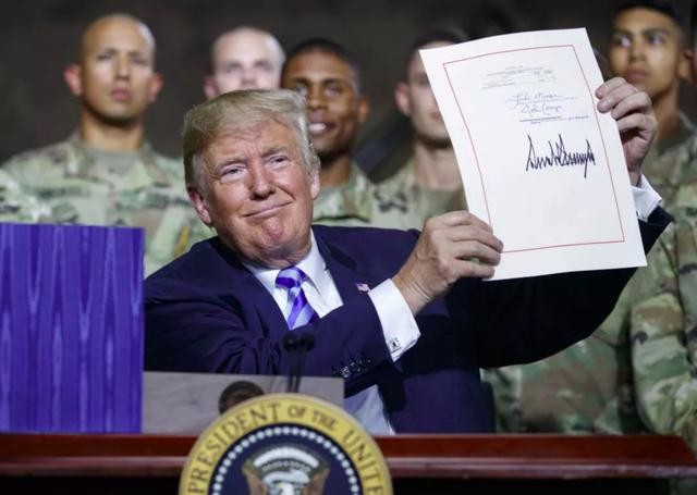 2018年8月13日,美国总统特朗普展示他在2019财年国防授权法案文本上的签名。