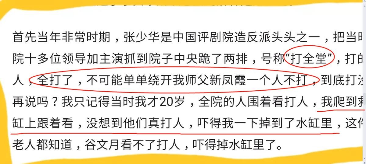 而她自己,也掉到水缸里了,并没有亲眼看到比她还小1岁的张少华,就动手打新凤霞了。