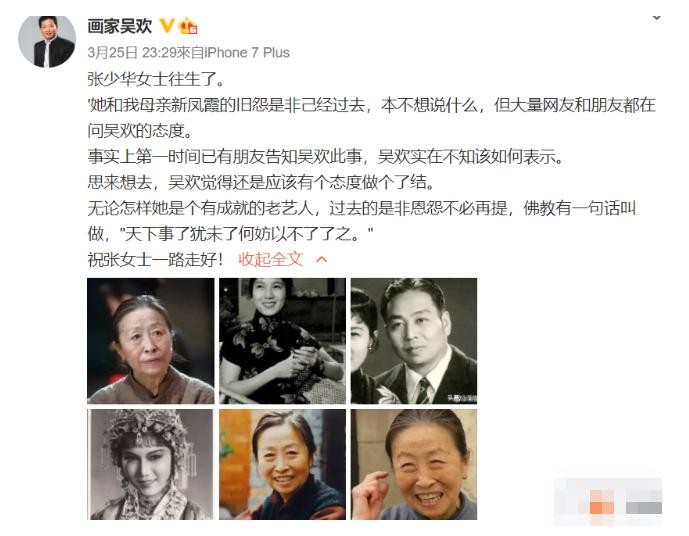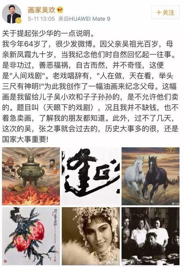 “张少华女士已经往生,吴欢亦已表态,是非本该了断,但网上仍有很多含混不清之论。试举几例,(截图在下面照片框内。)