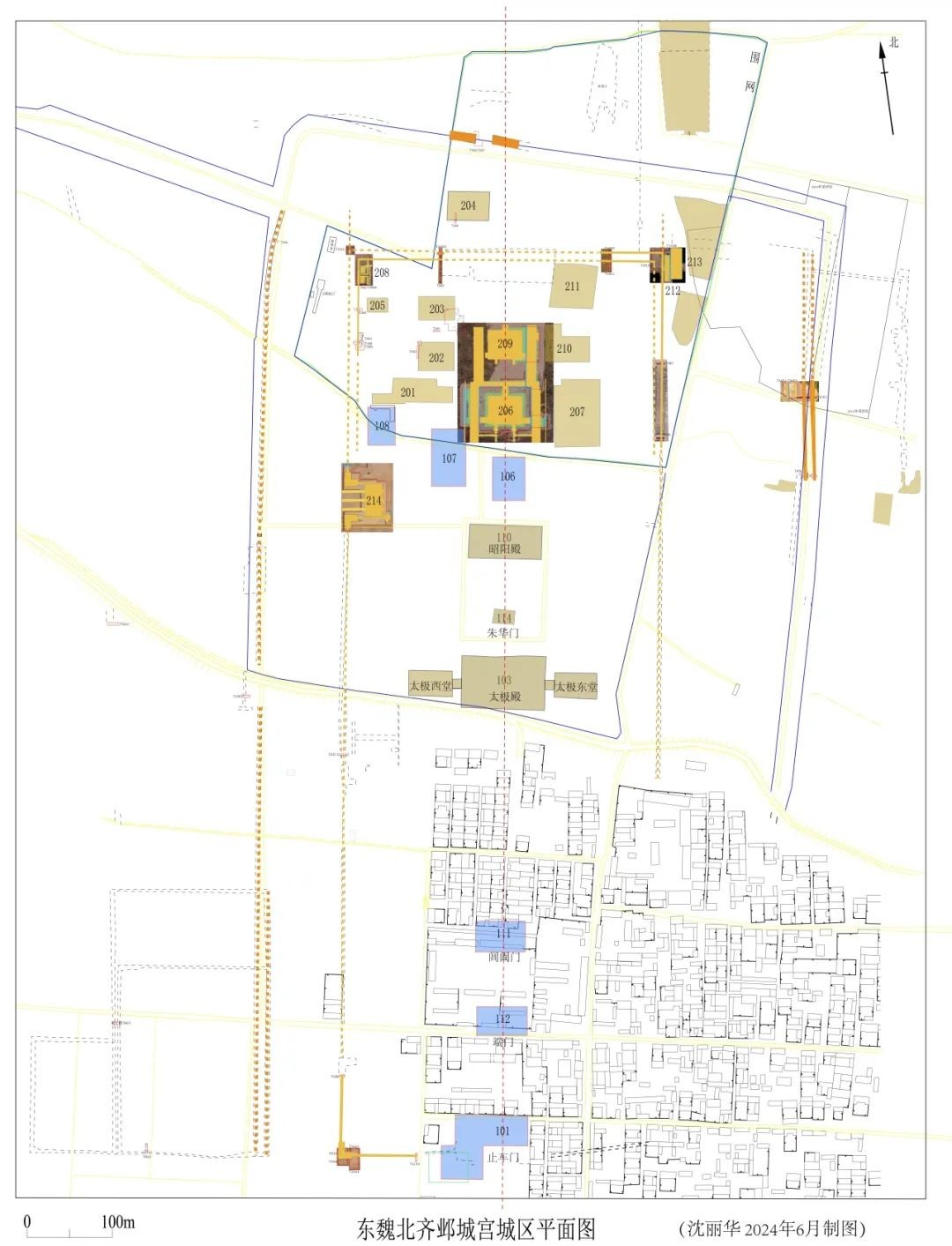 目前可基本明确,东魏北齐邺城宫城至少由内外两重宫墙围合而成,宫城设计和功能分区规整谨严,直接影响了唐长安城太极宫的建造(图2)。宫城轴线北部206号大殿及209号大殿的发现纠正了文献中关于后寝东、西二院并立的记载,确认宫城乃至都城中轴线的北端终点应位于宫城后寝核心部分。这样的宫城布局与明清北京城的故宫如出一辙,成为中国古代都城文明源远流长、延绵不断的重要物质文化实证。